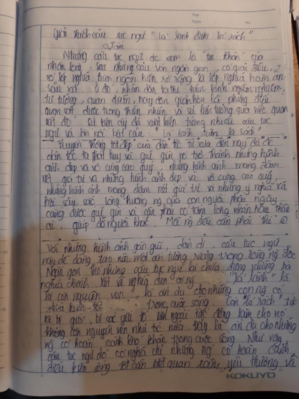 Kho tàng ca dao tục ngữ Việt Nam ta vô cùng phong phú. Những câu ca dao tục ngữ là lời ông bà ta dạy bảo, khuyên răn được lưu truyền qua câu tục ngữ. những câu tục ngữ luôn là lời dạy của ông bà, và cách dạy về nhân cách của con người,dạy con người biết yêu thương những người xung quanh. Những điều đó được thể hiện qua câu "Lá lành đùm lá rách”