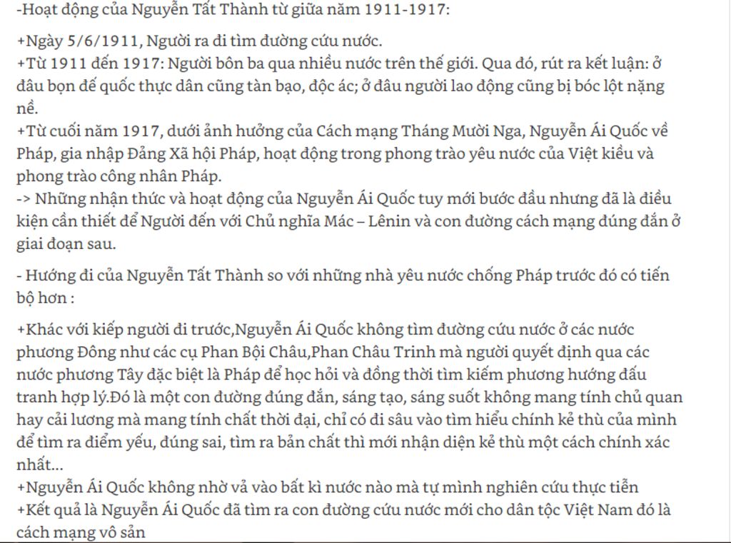 Từ 1911 đến 1917: Người bôn ba qua nhiều nước trên thế giới. Qua đó, rút ra kết luận: ở đâu bọn đế quốc thực dân cũng tàn bạo, độc ác; ở đâu người lao động cũng bị bóc lột nặng nề.