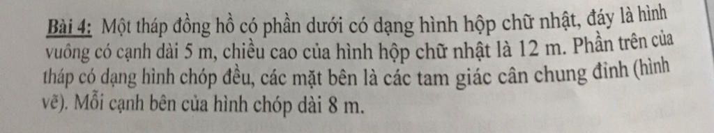Chiều cao tháp là $\dfrac{\sqrt{206}}{2}+12\approx19,2m$