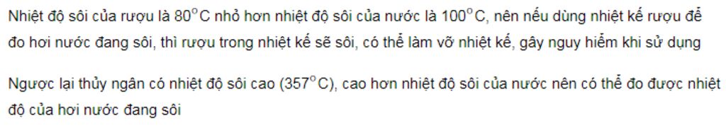 Để đo nhiệt độ nước đang sôi, ta dùng nhiệt kế thủy ngân. Vì nhiệt độ nước đang sôi là 100°C mà rượu sôi ở 80°C. Do đó, ta sẽ không xác định được nhiệt độ của hơi nước đang sôi.Và nếu nhiệt độ sôi của nước quá cao thì có thể làm vỡ nhiệt kế, rất nguy hiểm. Còn thủy ngân có nhiệt độ sôi lớn hơn 100°C nên ta có thể biết được nhiệt độ của hơi nước đang sôi.