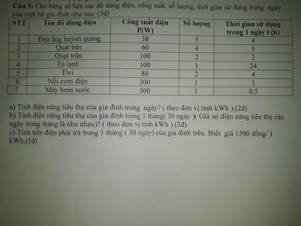 điện năng tiêu thụ 1 ngày là 5.9 kW/h(tính các đồ dùng diện tiêu thụ trong 1 ngày bằng cách nhân công suất với số lượng và thời gian sử dụng)