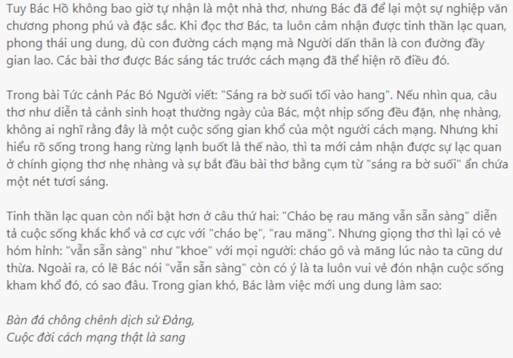 + Chữ “sang” tưởng như trái ngược lại hoàn toàn với hoàn cảnh khắc nghiệt, thiếu thốn ở 3 câu thơ đầu nhưng với một con người như Bác, thì đó lại là lời kết luận cho tất cả, bởi sống giữa thiên nhiên núi rừng Pác Pó, sống dưới bầu trời của dân tộc chính là điều “sang” nhất trong cuộc đời cách mạng của Bác.