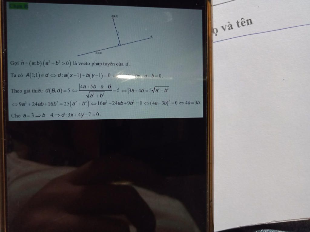 Vì d đi qua điểm A(1;1) và có vecto pháp tuyển n = (3;4), ta có phương trình đường thẳng d là: