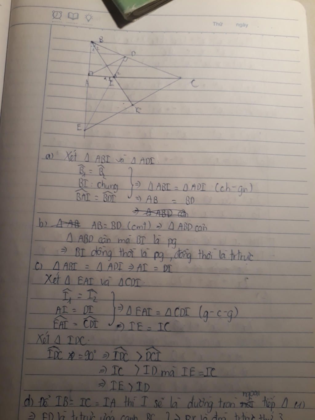 Do đó ∆AEI = ∆DCI (cạnh góc vuông - góc nhọn kề)