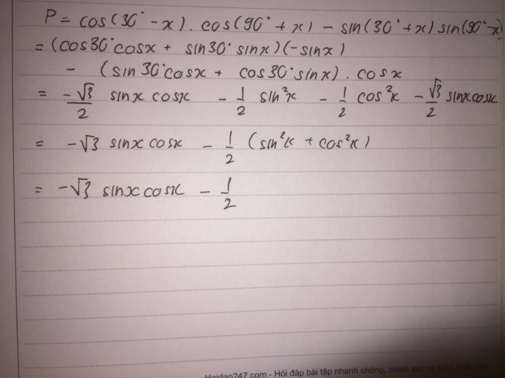 $P=\cos(30^{\circ}-x)\cos(90^{\circ}+x)-\sin(30^{\circ}+x)\sin(90^{\circ}-x)\\