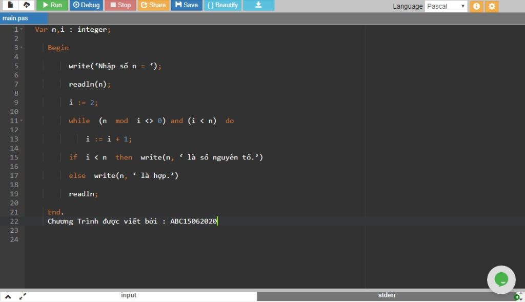 if i=n then writeln(n,' la so nguyen to') else writeln(n,' khong la so nguyen to');