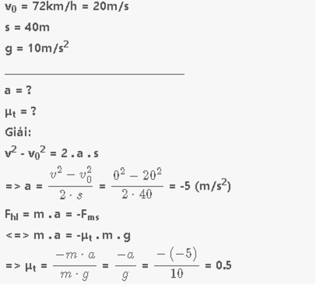 \(a = \frac{{{v^2}}}{{2s}} = \frac{{{{20}^2}}}{{2.40}} = 5\,\,\left( {m/{s^s}} \right)\)