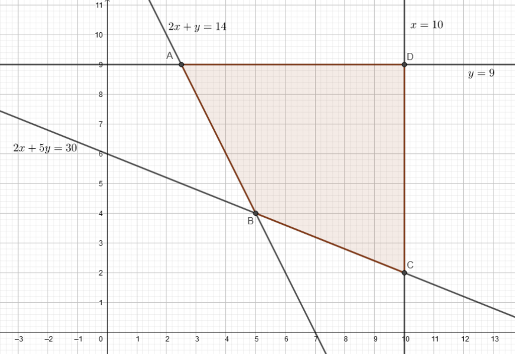 Ta có đồ thị như hình vẽ, từ đồ thị ta thấy, nếu x=5; y=4 thì giá tiền 4.5+3.4=32 đạt nhỏ nhất, còn nếu x=10, y=2 thì 4.10+3.2=46>32, tương tự các đỉnh A, D hay các điểm thuộc miền màu hồng đều >32.