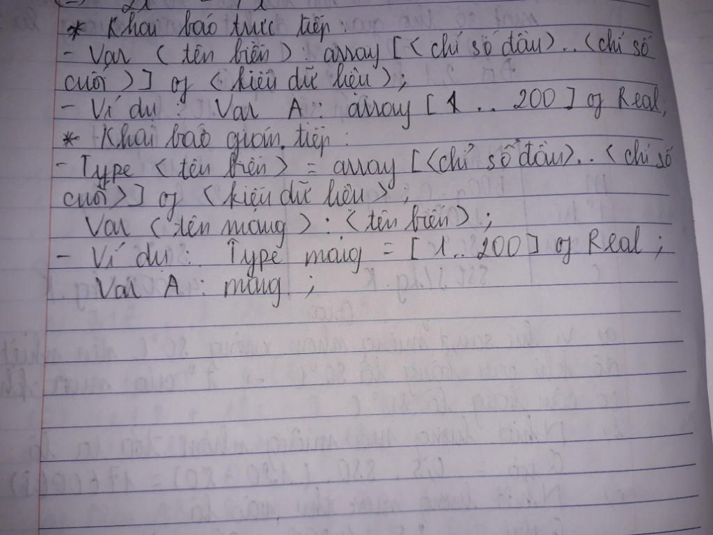 Var <tên biến mảng>: array[<giá trị đầu>..<giá trị cuối>] of <kiểu dữ liệu>;