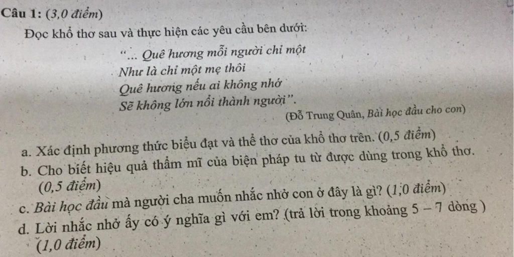 c, Bài học người cha muốn nhắc nhở: Phải biết nhớ về quê hương, về cội nguồn. Đây là yếu tố căn bản đầu tiên đẻ con người có thể trưởng thành nên người