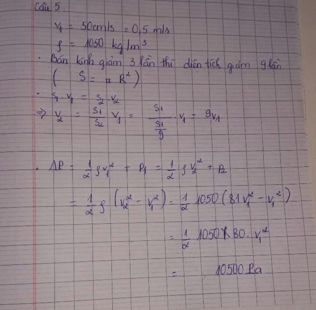 \[\frac{1}{2}\rho {v^2} + p = \frac{1}{2}\rho v{'^2} + p' \Rightarrow \Delta p = \frac{1}{2}\rho \left( {v{'^2} - {v^2}} \right) = \frac{1}{2}.1050.81.{\left( {0,5} \right)^2} = 10500Pa\]