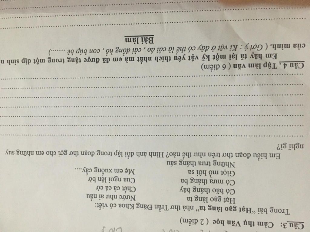- Đoạn thơ trên đã mang đến cho em một nội dung vô cùng ý nghĩa, đó là: để có những hạt gạo trắng ngần, thơm nức, không thể không nhắc đến những hi sinh nhọc nhằn, vất vả, dầm mưa dãi nắng của các cô, các bác nông dân mà điển hình chính là mẹ. - Hình ảnh đối lập được nhắc đến trong đoạn thơ trên đã gợi cho em rất nhiều suy nghĩ: Với việc sử dụng liên tiếp các hình ảnh đối lập như "bão", "mưa" vừa giúp đoạn thơ thêm sinh động, gợi tả vừa gợi ra những vất vả, lo toan của mẹ. Dưới tác động của thiên nhiên, những cây lúa mẹ trồng có thể bị đổ rạp, bị gãy. Như vậy, con sẽ không có cơm để ăn. Bên cạnh đó, vào những buổi trưa nắng hừng hực, như thiêu cháy con người, mà mẹ vẫn không quản ngại nặng nhọc, lội xuống mương để cấy, để sản xuất ra những hạt gạo trắng ngần nuôi em lớn khôn. Rút gọn- Đoạn thơ trên đã mang đến cho em một nội dung vô cùng ý nghĩa, đó là: để có những hạt gạo trắng ngần, thơm nức, không thể không nhắc đến những hi sinh nhọc nhằn, vất vả, dầm mưa dãi nắng của các cô, các bác nông dân mà điển hình chính là mẹ. - Hình ... xem thêm