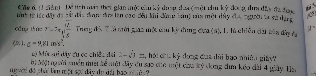 $\Leftrightarrow L=\frac{2^2.9,81}{\pi^2}\approx 3,98(m)$