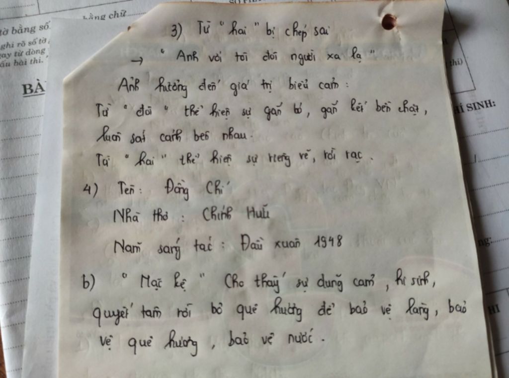 Câu 2: Từ chép sai là "hai" -> đúng là từ "đôi" . Chép sai như vậy sẽ làm cho mạch cảm xúc của tác giả nó nhạt đi, mất đi sự gắn bó, thân thiết, gần gũi của người lính cụ Hồ. Vì "hai" là số lượng, còn "đôi" là lượng từ nó có nghĩa gắn kết gần như hòa quyện.