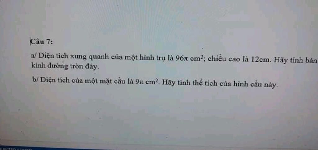 a, Bán kính đường tròn đáy là: r=Sxq/(2*h*π)=96π/(2*12*π)=96π/24π=4cm