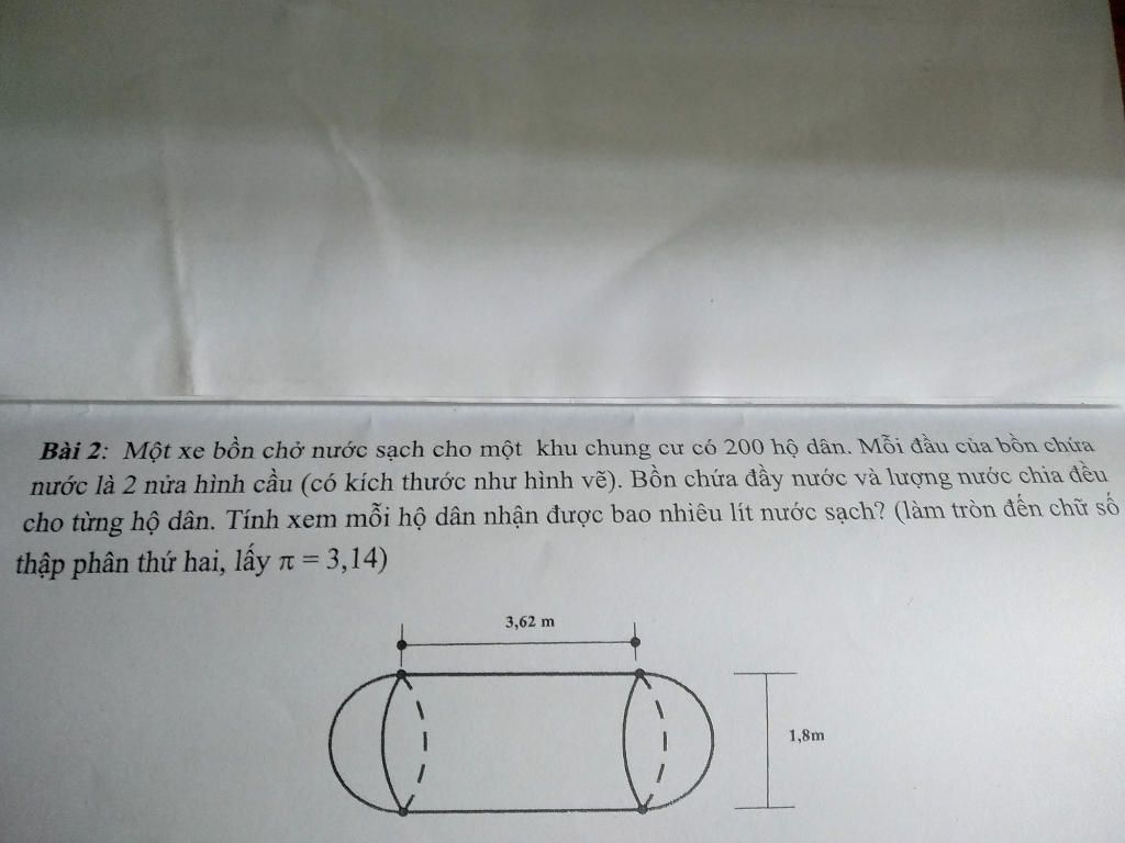 Hình trụ có bán kính đáy bằng bán kính hình cầu R=0,9 (m) và có chiều cao h=3,62(m) .Thể tích phần hình trụ của bồn nước là: V1=πR2.h =3,14.(0,9)2.3,62 (m3) Hai đầu của bồn nước có thể tích bằng thể tích của một hình cầu có bán kính chính là bán kính của đáy hình trụ nên thể tích hai đầu của bồn nước là:V2=43πR3 =43⋅3,14.(0,9)3 (m3) Thể tích bồn nước là:V=V1+V2 =3,14.(0,9)2.3,62+43⋅3,14.(0,9)3≈12,26(m3) Lượng nước sạch mỗi hộ dân nhận được là: 12 260:200 = 61,3 (lít). Rút gọnHình trụ có bán kính đáy bằng bán kính hình cầu R=0,9 (m) và có chiều cao h=3,62(m) .Thể tích phần hình trụ của bồn nước là: V1=πR2.h =3,14.(0,9)2.3,62 (m3) Hai đầu của bồn nước có thể tích bằng thể tích của một hình cầu có bán kính chính là bán kính... xem thêm