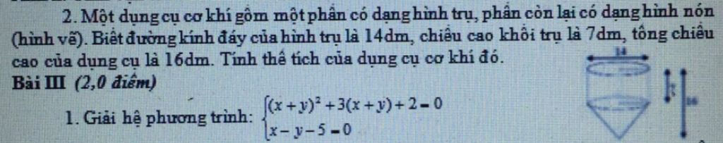 + Phần hình nón có bán kính đáy bằng bán kính đáy khối trụ bằng 7dm và chiều cao bằng: