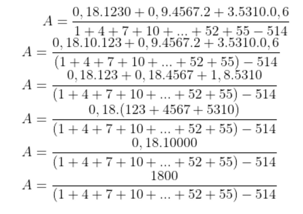 a = 0,18 * 1230 + 0.9 * 4567 * 2 + 3* 5310 * 0.6 / 1+ 4 +7+10 +...... + 52 + 55 -514 (1)