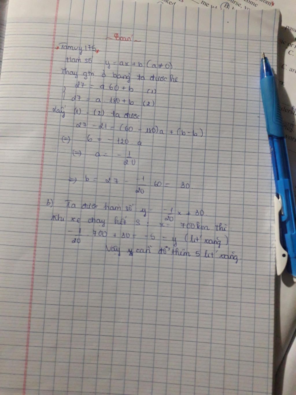 1 ô tô có bình xăng chứa b(lít) xăng. Gọi y là số lít xăng còn lại trong bình xăng khi ô tô đã đi quãng đường x(km). y là hàm số bậc nhất có bốn số x cho bởi công thức y=ax+b (a là lượng xăng tiêu thụ khi đi được km, a<0) thỏa bảng giá trị x(km) 60 180 | y(h) 27 21