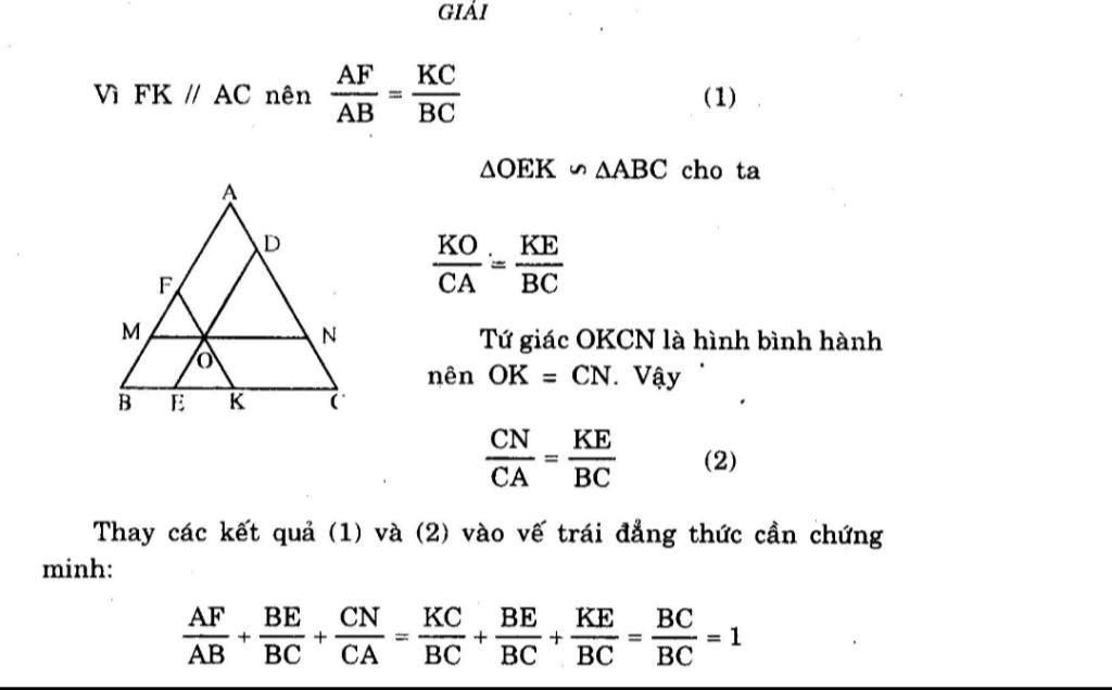 qua điểm O tùy ý ở trong tam giác ABC ta kẻ đường thẳng song song với AB cắt AC và BC tại D và E đường thẳng song song với AC cắt AB và BC tại f và K đường thẳng song song với BC cắt AB và AC tại M và N Chứng minh rằng AE trên AB + BC trên BC + c m trên C K = 1