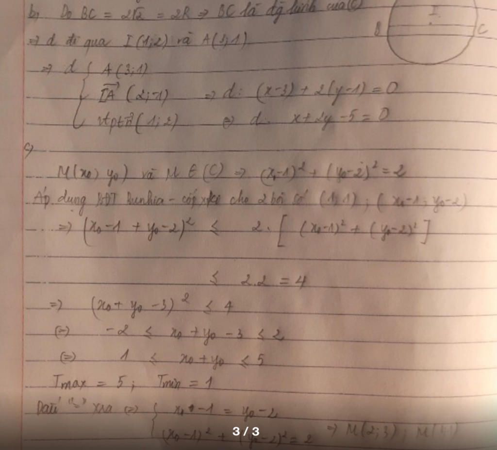 $\to \begin{cases}x+y=5\\(x-1)^2+(y-2)^2=2\end{cases}\to x=2, y=3\to M(2,3)$