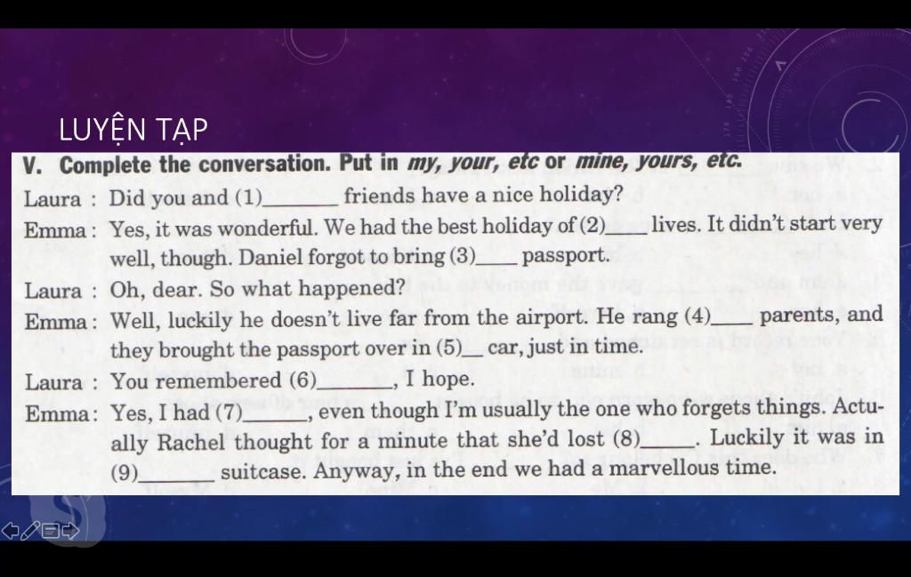 V. Complete the conversation. Put in my, your, etc or mine, yours, etc.