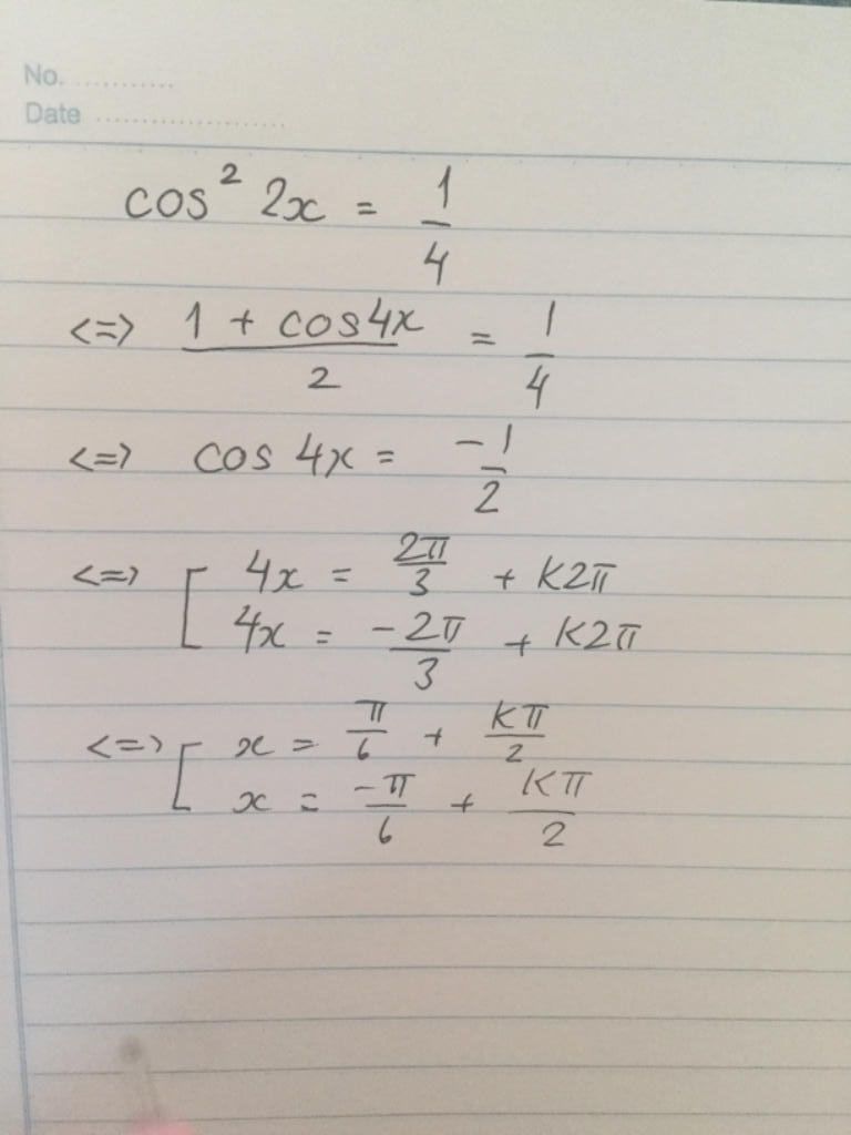 <=> 4x = 2pi/3 + 2kpi và 4x = -2pi/3 + 2kpi