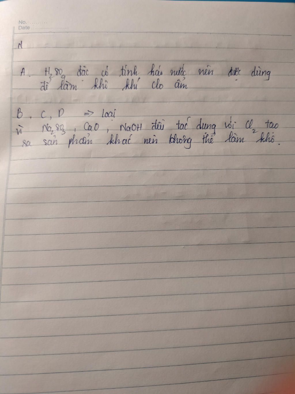 ⇒vì H2SO4 đặc có tính hút ẩm mạnh nên sẽ làm khô dc khí Cl2