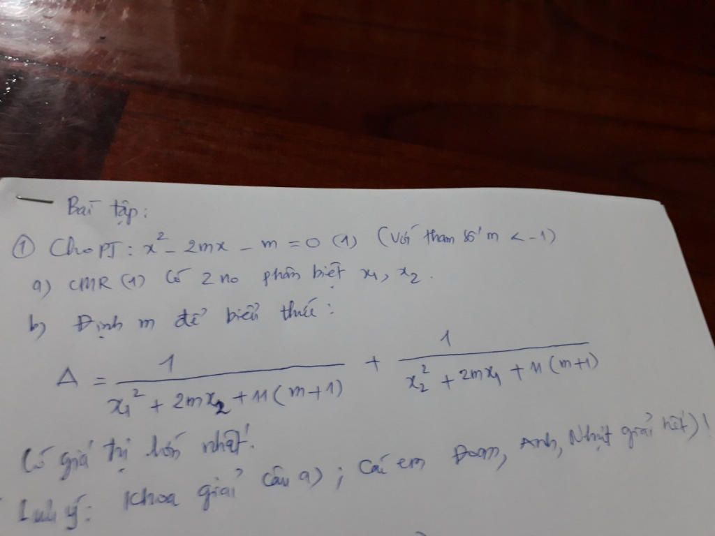 vậy:pt (1) luôn có 2 nghiệm pb vs mọi m<-1