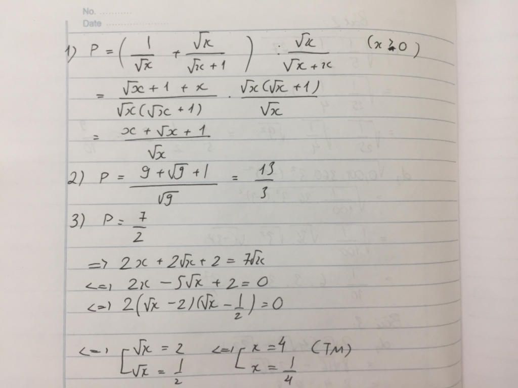 \Rightarrow \dfrac{{x + \sqrt x + 1}}{{\sqrt x }} = \dfrac{7}{2}\\