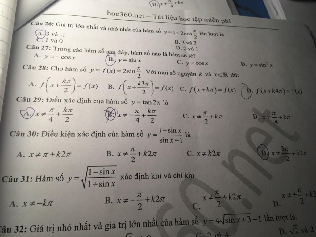 Câu 26: Giá trị lớn nhất và nhỏ nhất của hàm số y=1-2cos lần lượt là