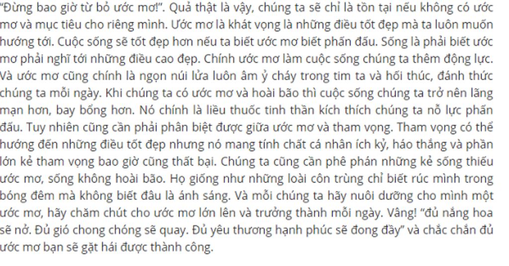 Mỗi người trong chúng ta đều có ước muốn, dự định riêng có người mong muốn cuộc sống hạnh phúc, công việc ổn định, có người thích đi du lịch đây đó,.... Ước mơ và hoài bão là điều giúp cho cuộc sống ý nghĩa hơn, cuộc sống cần có niềm vui và cả những ước mơ, hai yếu tố luôn đi song hành với nhau.